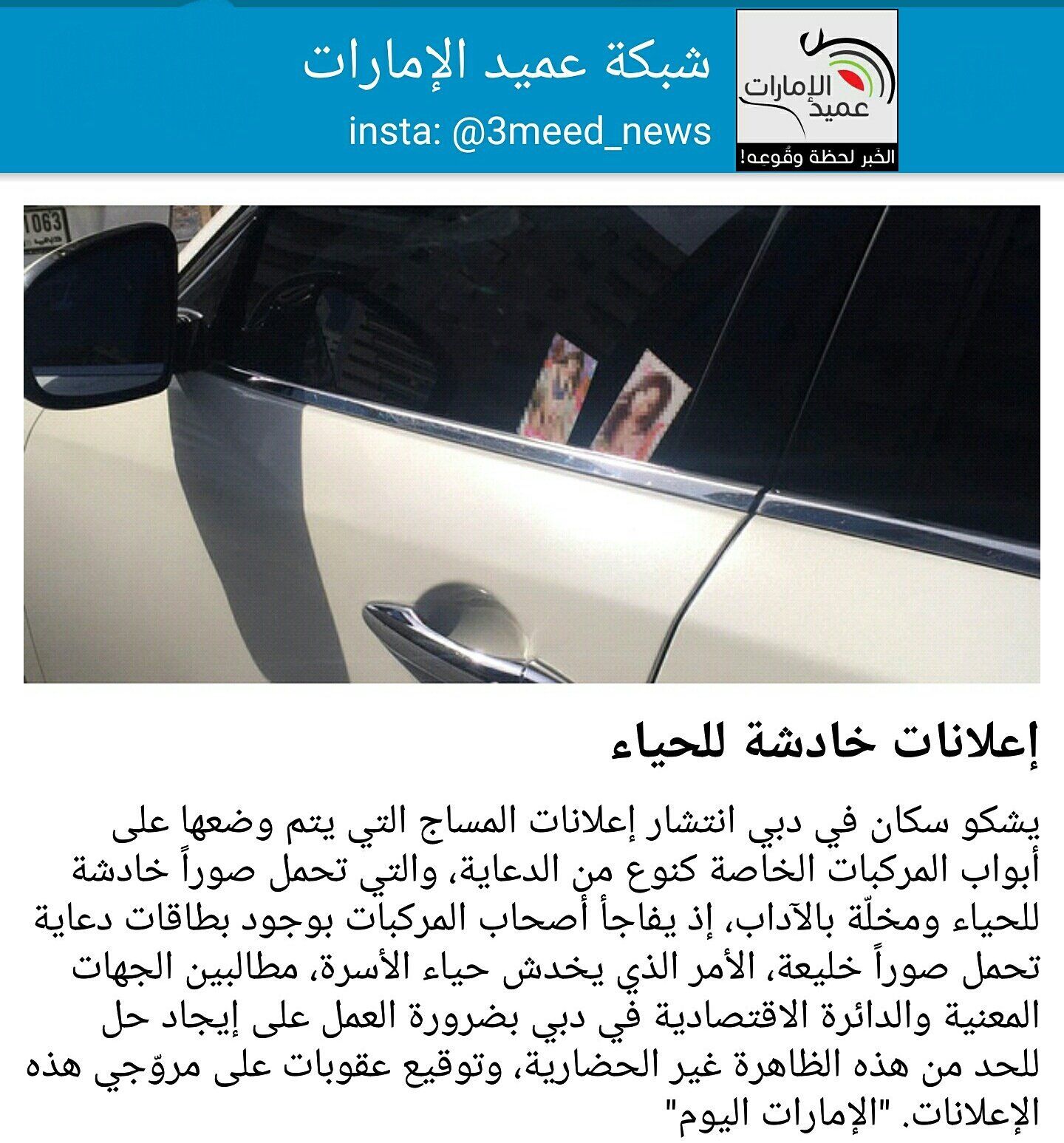شبكة عميد الإمارات No Twitter يشكو سكان في دبي انتشار إعلانات المساج التي يتم وضعها على أبواب المركبات الخاصة كنوع من الدعاية والتي تحمل صورا