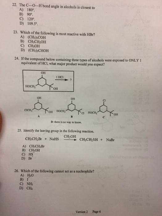 Solved The C O H Bond Angle In Alcohols Is Closest To A Chegg Com
