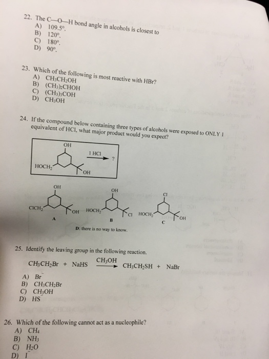 Solved The C O H Bond Angle In Alcohols Is Closest To A Chegg Com